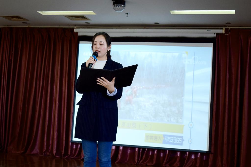 第三环节为学习模范。由韦红雪老师为大家讲述了3月30日凉山森林火灾中救火英雄们的先进事迹,而后又播放了他们英勇救火的视频。救火英雄们冲锋在前、不畏牺牲的精神深深震撼、感动、净化了在场师生的心灵。