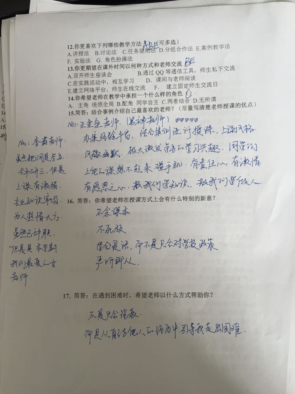 10月16日-17日,检察系通过问卷调查的形式,向每个教学班发放调查问卷,设置了“当课堂纪律不好,有学生在睡觉或玩手机,你希望上课的老师怎么办?”、“你最希望老师在哪方面给予你指导和帮助?”、“你希望老师在授课方式上有什么特别的新意?”等问题。问卷调查的结果统计后及时反馈给了一线教师,希望加强老师对学生的认识,改进自己的教学,达到了“教学相长”的目的。