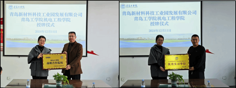 最后,张丽涓经理代表青岛新材料科技工业园发展有限公司为机电工程学院授予 “战略合作院校” 牌匾;实验教学中心主任王磊代表机电工程学院为青岛新材料科技工业园发展有限公司授予 “优秀实习单位” 牌匾,充分肯定公司在学生实习工作中的突出表现与卓越贡献。